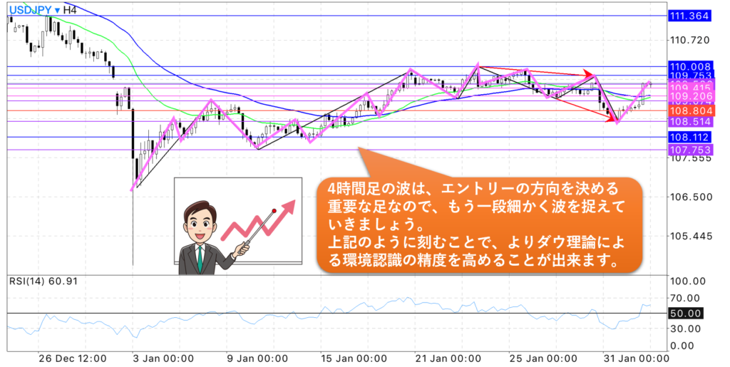 ポイントは、特にエントリー方向を決める4時間足に関して、「細かく波をとらえた方がいい」ということ。