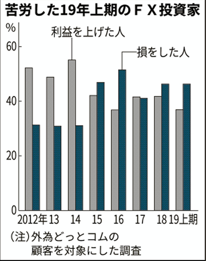 大手FX会社の一角である外為どっとコムの顧客を対象にした調査によると、2019年上期は37%の人が儲かり、46%の人は損をしたというデータが示されています。