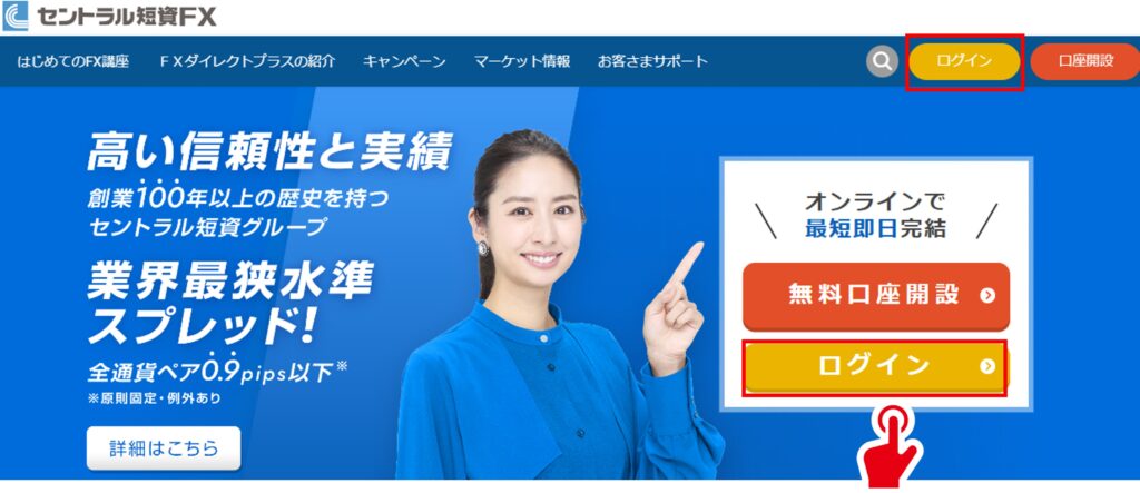 以下のボタンからセントラル短資FXの公式ホームページを開き、「口座開設はコチラ(無料)」をクリックします。