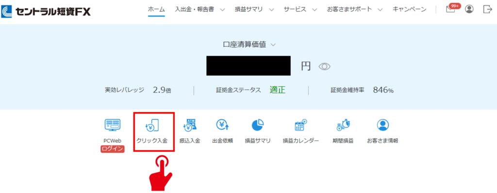 管理画面にアクセス出来たら、「クイック入金」を押して入金手続きを行いましょう。