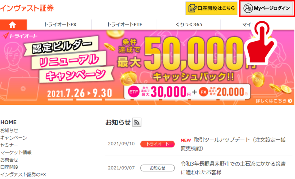 インヴァスト証券の公式サイトにて、右上の「Myページログイン」をクリックしましょう。