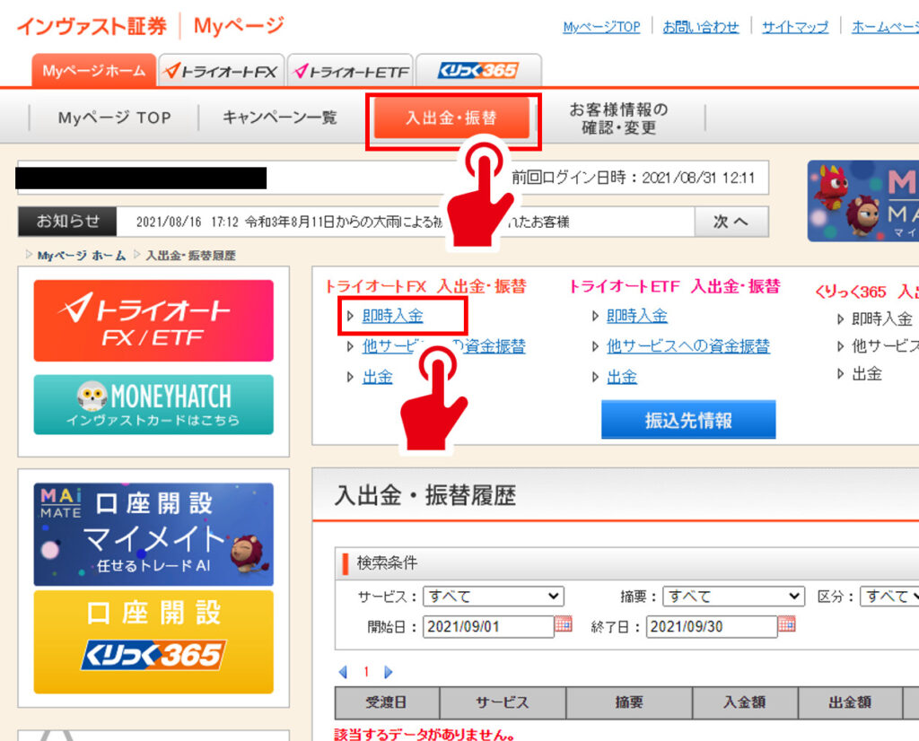 そこで、上部の「入出金・振替」を選択し、真ん中にある「即時入金」をクリックしましょう。