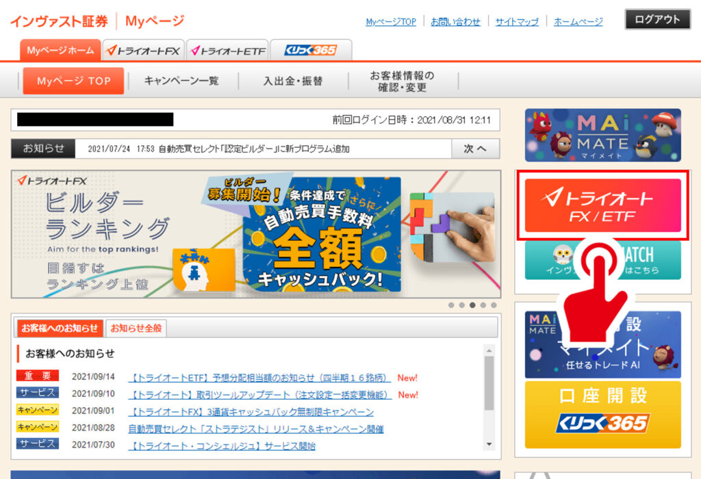 MyページTOPから、右側のサイドバーにある「トライオートFX/ETF」をクリックしましょう。