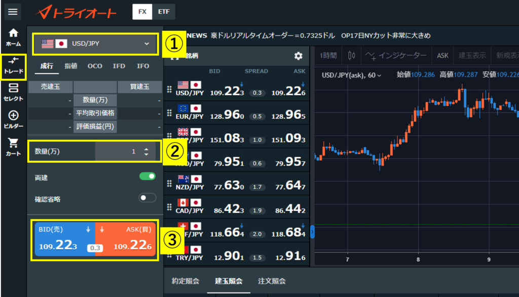 最後に、「買い」で始めるか「売り」で始めるかを決めましょう(③)。