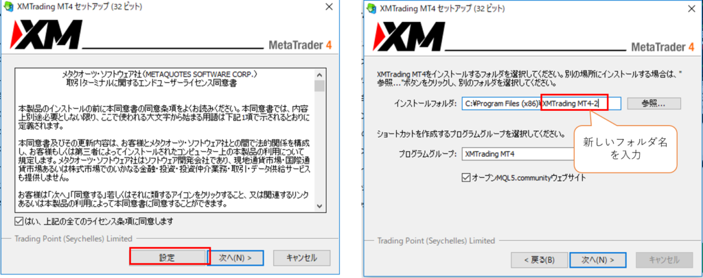 インストールフォルダを、例えば「MT4-2」などに変更しましょう。