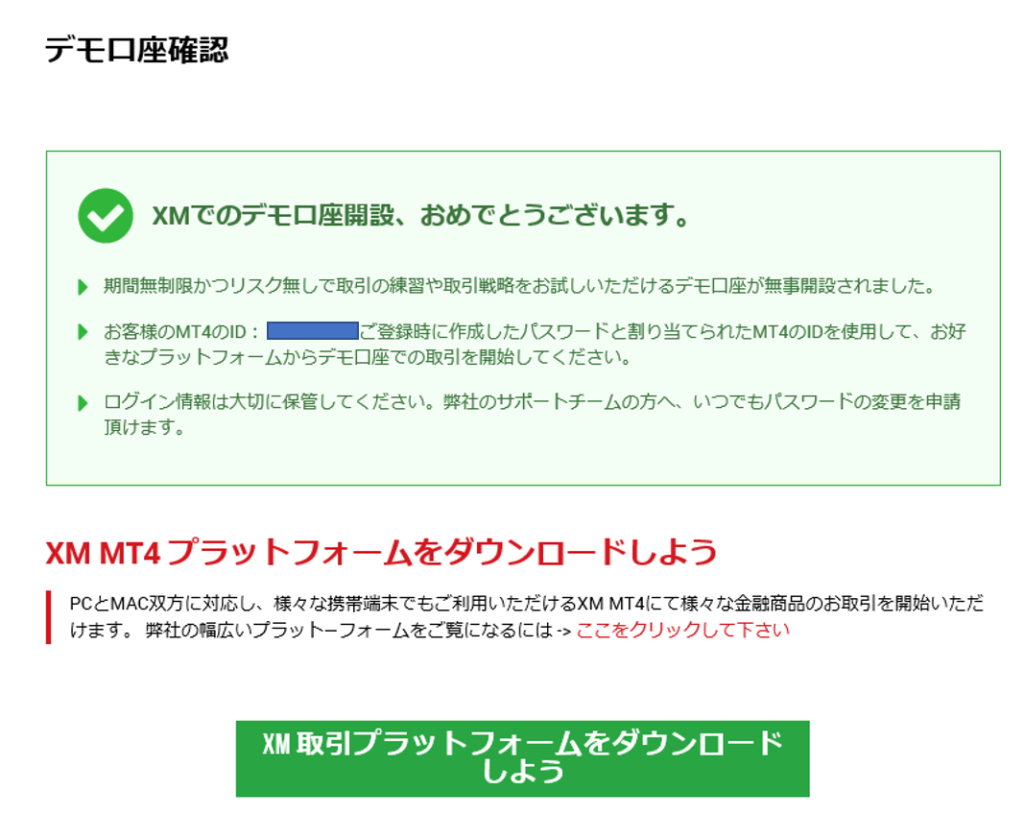 3. 最後に「デモ口座を開設」のボタンを押すと、確認メールが届きますので、そのURLを押して以下の画面が出れば口座開設は完了です